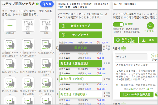 用意されているテンプレートの空白部分に、(商品に関する)説明や内容を埋めていっただけでしたが、設定日時に配信される「LINEメッセージ」や、セミナー映像を見せて、その感想を送ることができるサイトが完成しました。この仕組は、今でも、ほぼ全自動で動き続けているので、その分、他の業務に集中できるので助かっています。