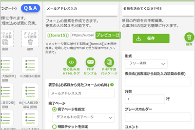 簡単操作で様々なフォームを作れます。よく使われる問い合わせや申し込みフォームであれば30秒あれば十分。必須項目の設定や、事前に登録済みの値は最初から入力済みにしておく便利な機能もチェックボックスだけで設定可能です。